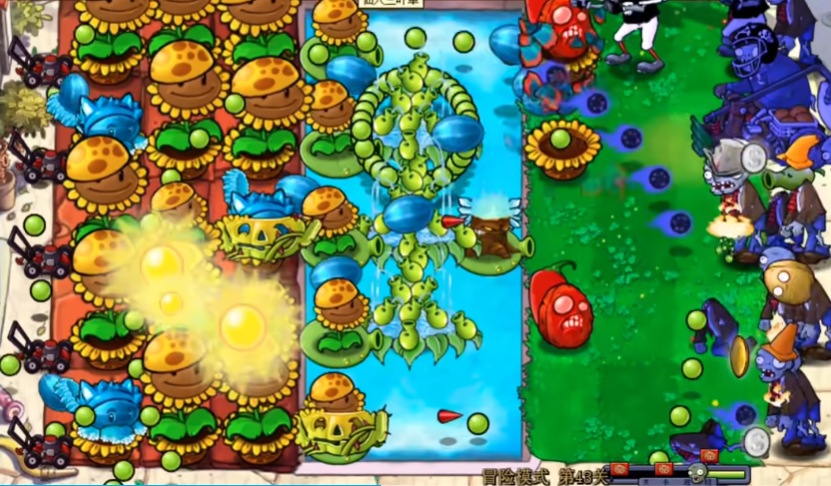 植物大战僵尸杂交版第43关的核心策略在于合理搭配范围伤害植物与防御植物,重点利用冰瓜大喷菇的减速和AOE效果对抗机枪僵尸群。开局需快速建立阳光经济,优先种植阳光向日葵或阳光菇投手,并在左侧布置小盆菇延缓僵尸进攻。第一波僵尸出现时需用辣椒坚果抵挡机枪僵尸的爆发伤害,同时在水池区域种植豌豆睡莲和寒冰香蒲形成初步防线。