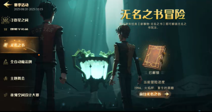 无名之书是一个重温原著经典剧情的特殊玩法,里面包含多个章节的挑战。每个章节都有独特的剧情和战斗机制,完成挑战可以获得枫木魔杖等丰厚奖励。进入后点击打开书本就能开始体验这些精彩内容,左上角会显示当前获得的星数,集齐27颗星能拿到最终奖励。