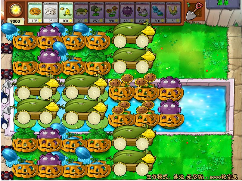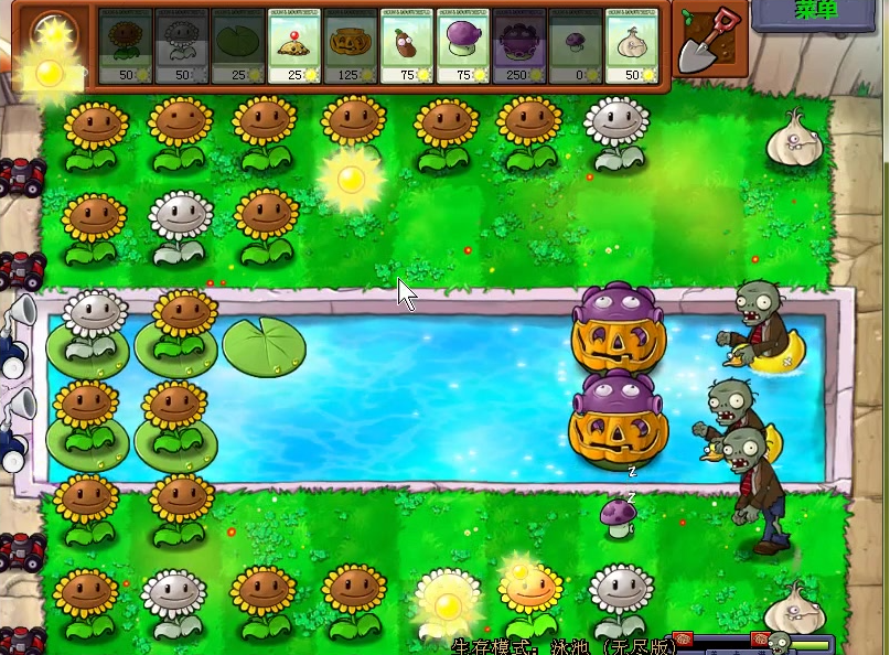 泳池无尽模式的核心在于快速建立阳光经济体系,前期咱们得疯狂种向日葵,至少保证8-10株双胞向日葵稳定产阳光。开局记得带变身茄子复制向日葵,配合大蒜头对付初期僵尸,阳光攒到2000左右立刻开始布局玉米加农炮。水路前排放忧郁蘑菇配合大蒜引导僵尸走位特别重要,这样能让喷菇火力覆盖更多目标。