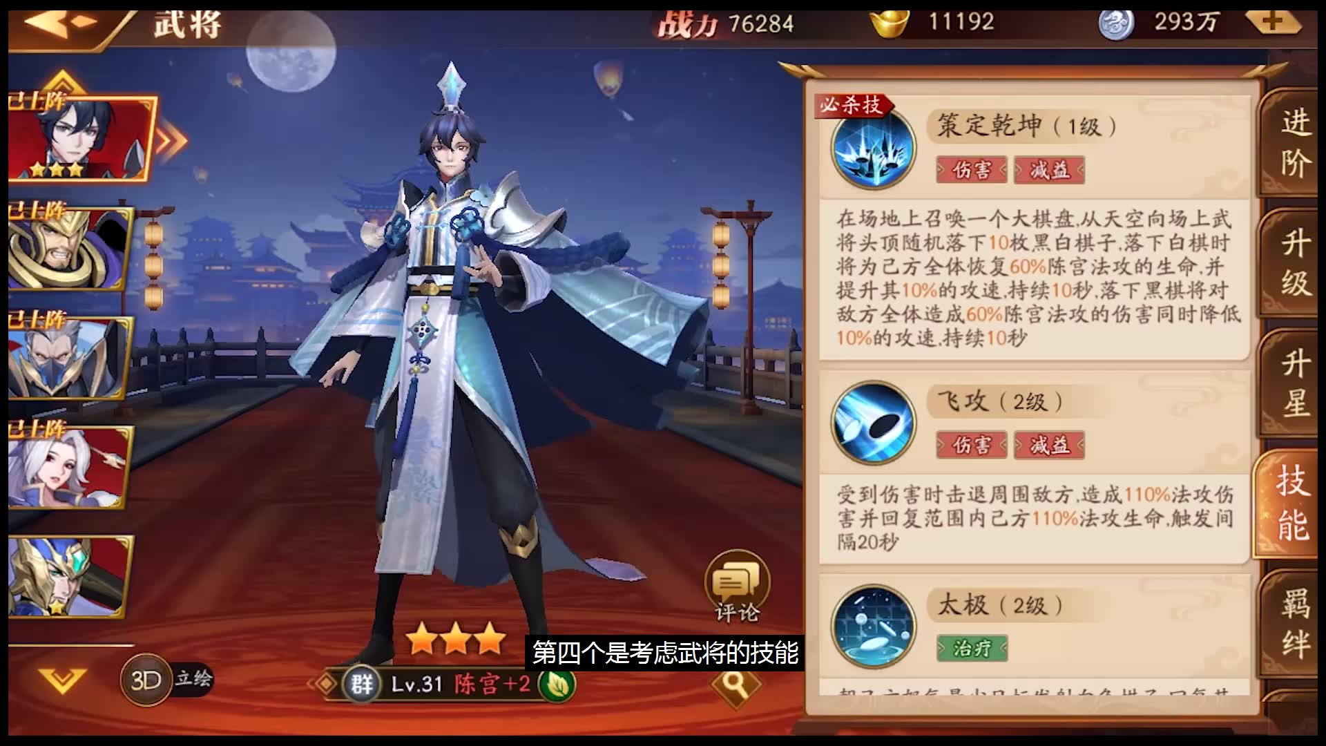 陈宫定位为谋士,兼具控制、辅助和一定输出能力,适合放在中后排位置。他的技能包括随机交换敌方目标位置、束缚效果以及切断敌方武将支援的能力,这些特性决定了他需要相对安全的站位才能发挥最大作用。由于谋士职业本身防御较低,若放置在前排容易过早阵亡,因此中后排是最优选择,既能保证生存,又能有效干扰敌方阵容。