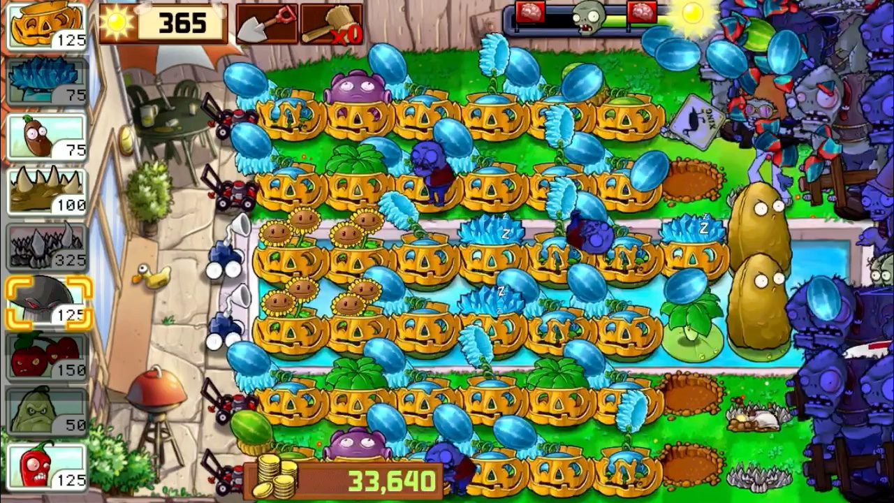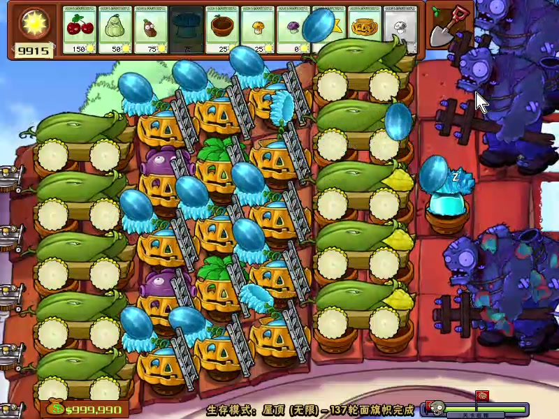 合理的布阵是生存的关键。核心思路围绕玉米加农炮、冰瓜和忧郁菇展开,这三种植物构成防御体系的基础。玉米加农炮提供高爆发伤害,冰瓜负责群体减速,忧郁菇则清理近距离的小型僵尸。阳光管理同样重要,前期需快速积累至9990上限,为后期补种植物预留资源。建议优先在水路和陆地关键位置部署玉米加农炮,并为其配备南瓜套保护。