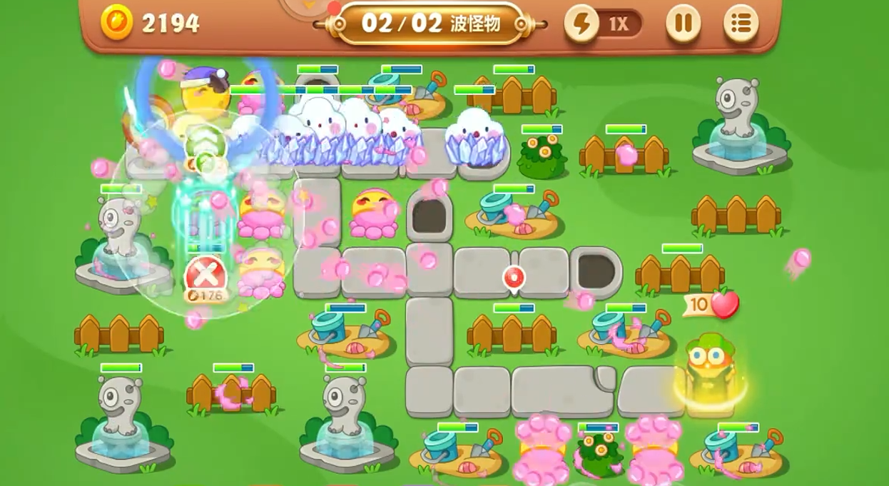 后期面对护盾机械兔时,记得在Y型路口后方补2座毒针形成持续伤害。从第22波开始,每隔2波就会出现这种难缠的敌人,所以提前准备好减速和持续伤害很重要。左上角可以增加保龄球来清理左侧区域,右下角则用瓶子炮清理围栏。障碍物清完后,别忘了放三个雪花塔来控场,有金币就立即升级它们。这时候整体阵型应该已经成型了,上方布满章鱼,下方以飞机为主力,中间穿插着多重箭和魔法球。