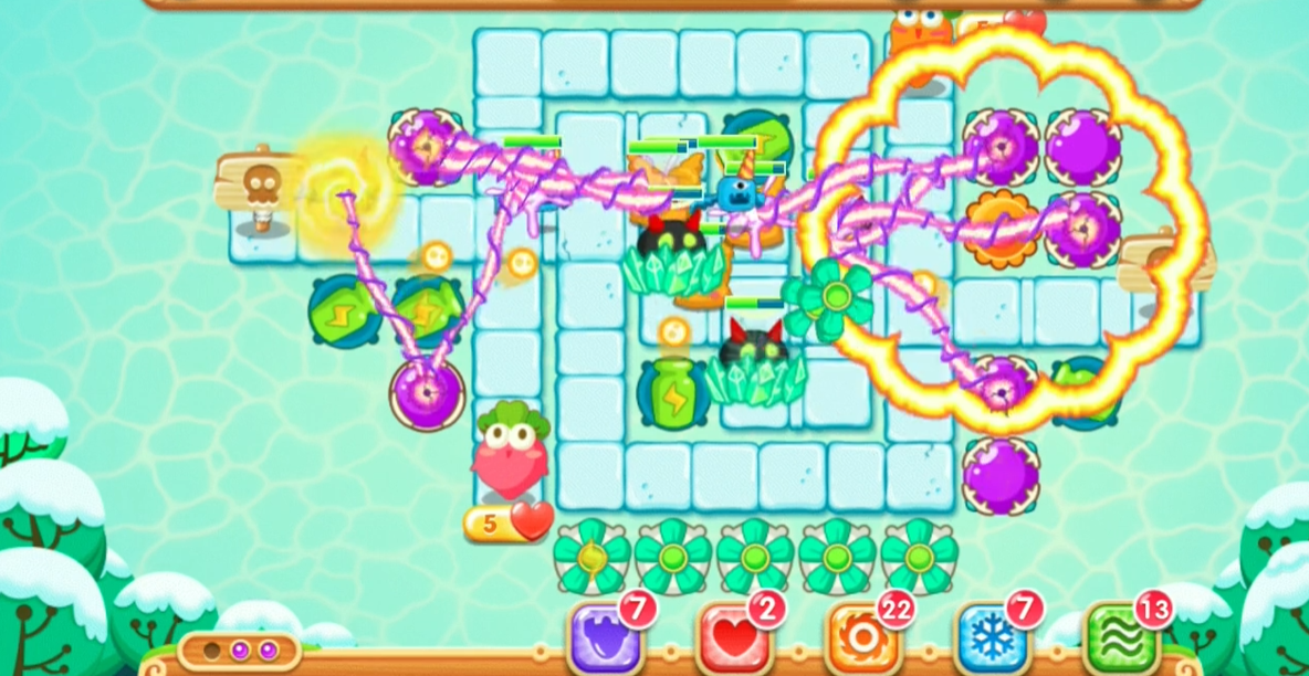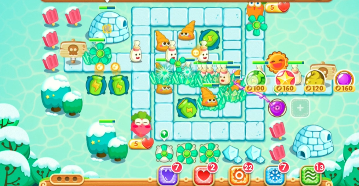 中期阶段需集中火力清理左侧松树,完成后建造顶级风扇炮塔减速怪物。剩余两棵松树清理后,资金优先用于升级已有的4号和5号飞机炮塔至顶级。冰锥旁补充6号和7号飞机炮塔,兼顾输出与道具清理。下方道具清除后,在4号和5号飞机下方建造8号和9号飞机炮塔,风扇下方补充第10号飞机炮塔,形成基础防御阵型。此阶段需注意怪物波次节奏,适时调整炮塔攻击目标。