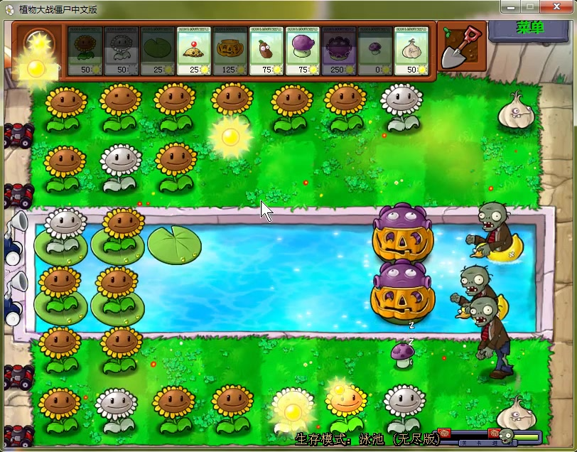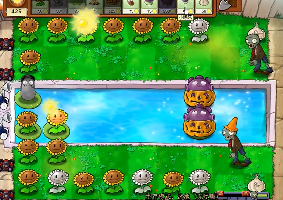 无尽挑战想要打得远,关键在于阵容搭配和节奏把控。开局咱们得优先种满双头向日葵,至少两排起步,阳光攒到9999上限之前别急着乱花。水路记得放吸金菇自动收钱,省下操作时间。前几波僵尸用土豆雷和窝瓜对付就行,重点是把经济拉满。冰西瓜尽早安排上,减速效果能让输出植物多打好几轮。玉米加农炮是后期核心,8个左右够用,放中间两排最安全,记得用南瓜头保护它们。