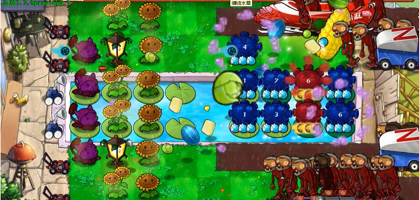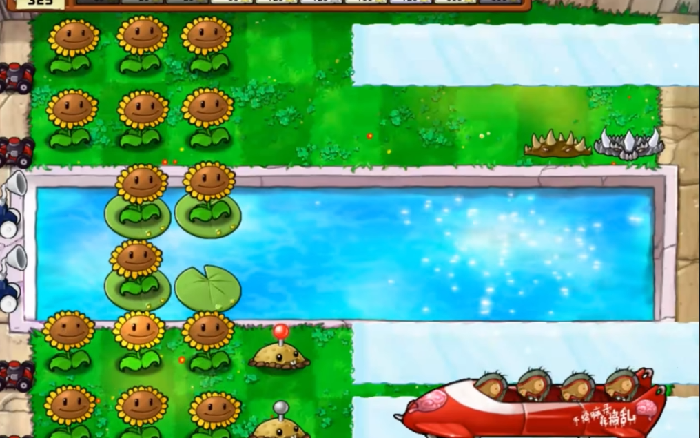 水上僵尸不用太担心,前期用水草过渡,后期在没冰道的位置放地刺王,有冰道的位置左右各补两个地刺。猫咪投手也是不错的选择,它能自动攻击范围内的僵尸,特别是对付冰车僵尸效果显著。如果遇到僵尸扎堆的情况,果断用樱桃炸弹或火爆辣椒清场,但要注意留一个辣椒备用以防雪橇僵尸突然刷新。