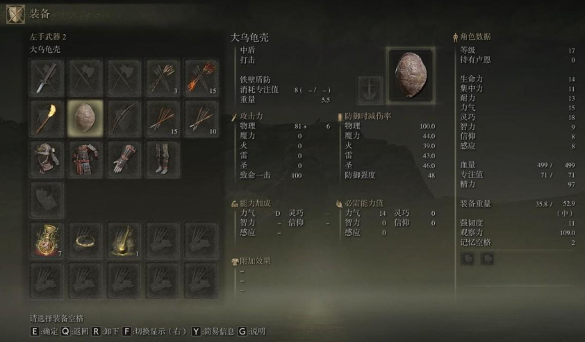 从装备属性分析,大乌龟壳属于中盾类别,除物理防御外还具备相当的魔力、火、雷、圣属性减伤率。其战技铁壁盾防能显著提升防御强度,配合高抵挡力在面对连续攻击时尤为有效。重量数值适中,适合力量属性达到12点的各类近战build早期使用,可平稳过渡至中后期更高级别的盾牌获取阶段。