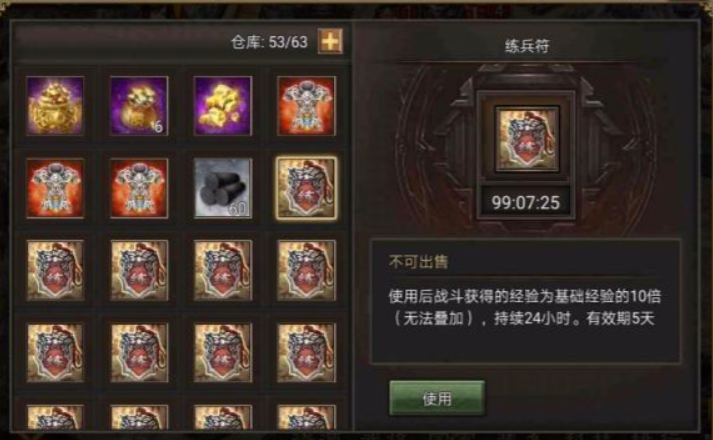 除了常规的练兵令,还有一种特殊的练兵符,它能在短时间内提供大量经验加成,非常适合冲级阶段使用。不过练兵符有使用时限,一般只有五天,而且最多只能获得五亿经验,所以咱们得提前准备好粮草和兵力,在有效期内尽量多刷经验。练兵符的BUFF效果不会显示在武将身上,但实际经验加成是实打实的,不用担心浪费。