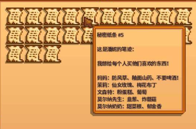查看秘密纸条的具体操作方法是:将纸条拖动到人物头像上方,点击人物后使用放大镜即可阅读内容。阅读完成后纸条会从背包中消失,但已获取的纸条记录会永久保存在菜单中。游戏中共有23张秘密纸条,其中9张记录着村民的喜好信息,其余大多与宝藏位置或特殊谜题相关。这些纸条的内容各不相同,有的提供任务线索,有的指向隐藏物品位置,需要玩家仔细解读。