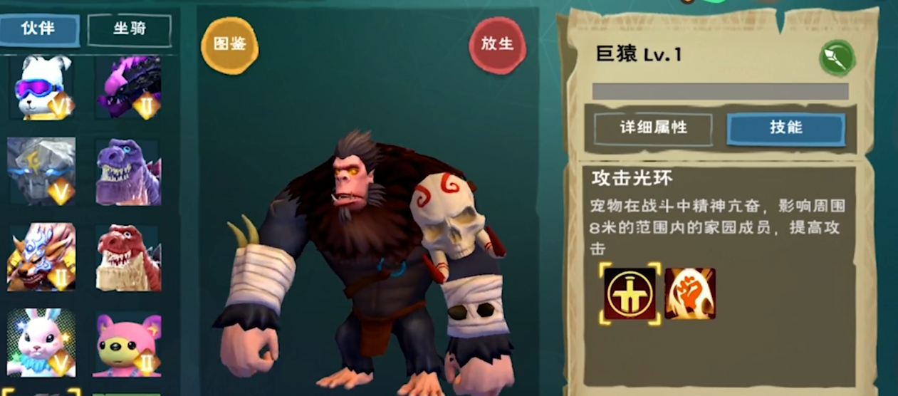 捕捉成功后,巨猿会成为咱们的强力战宠,拥有重击和攻击光环两个实用技能。重击能造成高额伤害,攻击光环可以提升8米范围内队友的攻击力。记得多带些水晶装备和回春术药水,这样在后续战斗中能更好地发挥巨猿的战斗力。热带雨林区域地形复杂,建议提前规划好路线。乐乐河谷和银月丘陵都有明显的石子圈标记,咱们可以根据这个特征寻找巨猿。