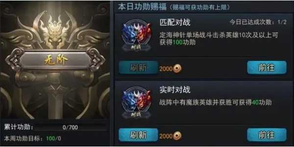 功勋获取主要通过完成每日任务和参与特定对战模式。每日任务固定提供260点功勋,包含修罗血战、天梯竞技场等常规玩法任务。匹配对战和实时对战则根据表现给予功勋奖励,其中匹配对战每日有2次任务次数限制,实时对战和六人对战无次数限制但存在350点的功勋获取上限。建议优先完成每日任务确保基础收益,再通过PVP玩法补充剩余功勋值。