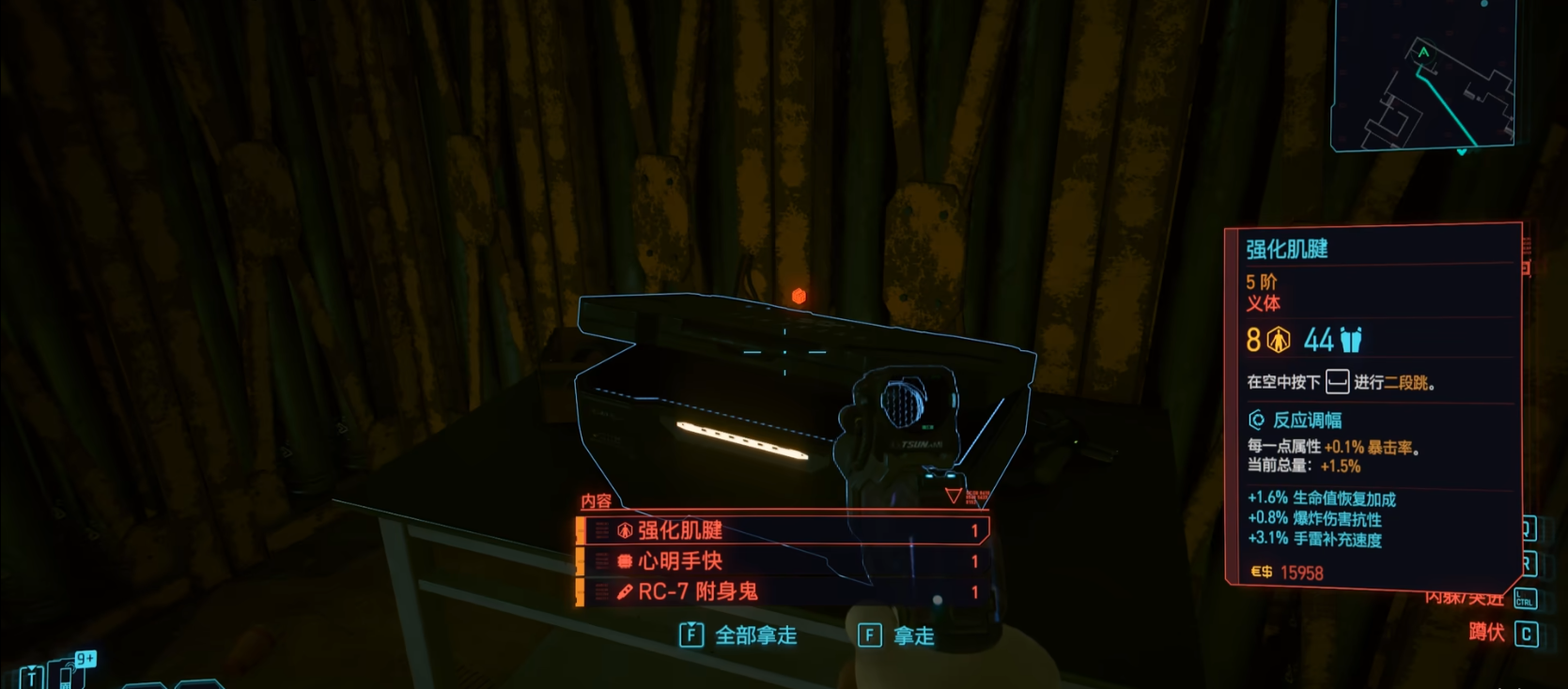 功能类义体能让你的生存能力直线上升。强化肌腱提供的二段跳简直是探索神器,轻松翻越障碍物到达隐藏区域。皮下护甲简单粗暴地增加护甲值,性价比超高还不影响外观造型。击杀治疗特别适合喜欢近战的玩家,击败敌人后立刻回血让战斗更持久。副心脏更是救命神器,生命归零时直接满血复活,冷却时间只有两分钟,简直是高风险战斗的保险栓。