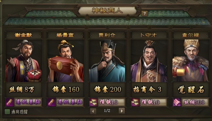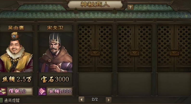神秘商人共有四位,分别是吴由褒、贾利仓、卜守财和宋戈卫,每位商人提供的商品和兑换条件不同。吴由褒需消耗5万银币通商,连续8天可获得升级洗练道具;贾利仓需消耗万灵石,12天后兑换秘技洗练道具;卜守财需3万木材,18天后兑换神技洗练道具;宋戈卫则需消耗紫装兑换套装碎片。玩家需根据自身资源储备选择优先级,长期坚持通商才能最大化收益。