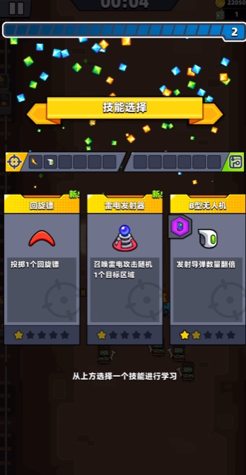 推荐使用苦无作为主武器,其自动追踪特性能够有效应对密集敌人,同时搭配轮盘、激光发射器和无人机作为辅助技能。被动技能优先选择经验书、子弹速度、子弹范围、机械臂和攻击力提升,这些组合能显著提高输出效率和生存能力。