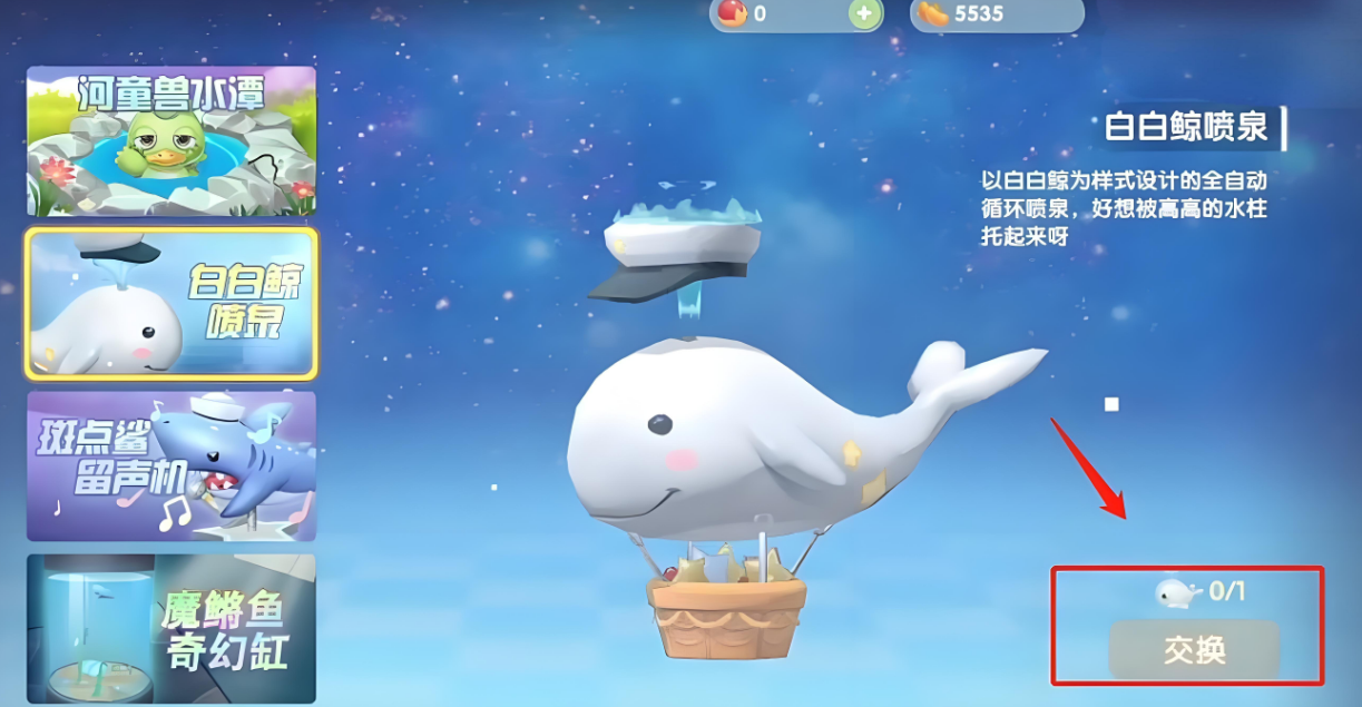 大白鲸本来就是稀有鱼种,可能需要多试几次。如果用了高级鱼饵和渔网还是没收获,可以换个时间段再来,比如试试傍晚或者早晨。钓到大白鲸后,别忘了去神秘商店找NPC大力兑换奖励。大白鲸可以换成一个超可爱的喷泉家具,摆在家里特别显眼。兑换地点在游乐场门口,找到大力后选择神秘商店就能操作。