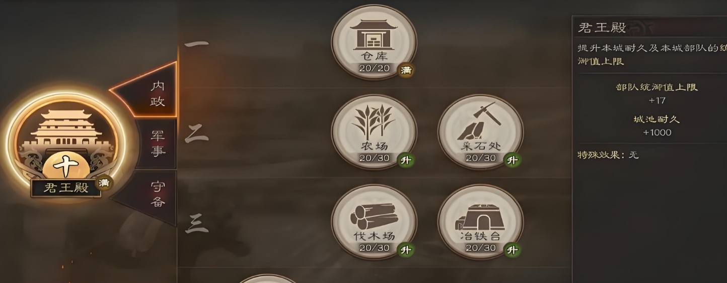 建造营帐是曹操势力扩张的重要战略手段。营帐作为临时军事据点,能够提供视野、加速部队调动并维持士气,尤其在远距离作战时作用显著。要建造营帐,首先需确保主城君王殿达到4级,随后在守备选项中解锁工程营和军机营。工程营决定营帐等级上限,军机营则影响可建造数量,建议前期至少将两者升至2-3级以满足基本需求。