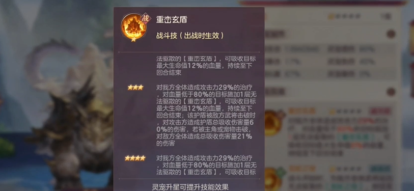 玄武作为核心灵宠之一,定位为防御型辅助,其技能机制围绕护盾和治疗展开。战斗技重峦玄盾能为全体队友恢复生命值,并对气血低于一定比例的目标附加吸收伤害的护盾,护盾被击破时会对攻击方造成反伤效果。助战技则与怒攻联动,将治疗溢出转化为护盾,同时提升对护盾目标的伤害能力。这种双形态技能设计使其在攻防两端均有战略价值,尤其适合持久战场景。