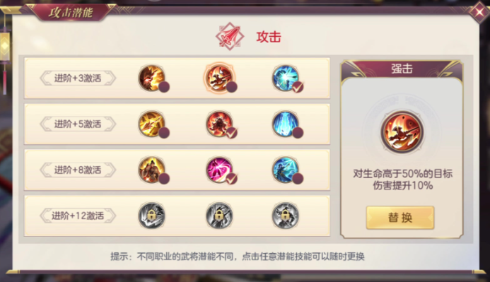生存向潜能需重点考虑沉默期间的防御短板。当阵容缺乏稳定驱散手段时,可将进阶12替换为御敌降低所受伤害,或进阶18选择避敌提高闪避率。若搭配华佗、步练师等驱散型辅助,则维持全输出潜能更为合理。潘凤无双5火提供的最终减伤和群体回血效果,一定程度上缓解了生存压力,因此潜能仍应以输出为优先。