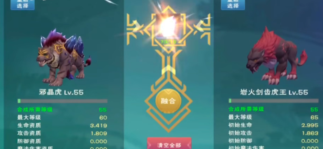 将45级岩虎与45级剑齿虎王融合为岩晶虎。剑齿虎王刷新于春日海岸附近的小岛,饲料需小龙虾、生牛肉和优质肉,共18包。此阶段需消耗4个融合石,且岩虎与剑齿虎王的资质总和决定了岩晶虎的最终属性。若追求极品资质,建议优先筛选高生命(3.366以上)与高攻击(1.7以上)的岩虎作为主宠。