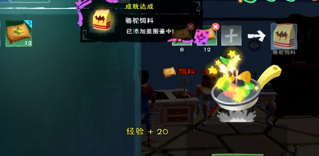 饲料制作涉及两个关键步骤:原料加工与烹饪合成。工作台加工阶段,5个玉米可合成1个玉米饲料包,5个小麦合成1个小麦饲料包。烹饪阶段将两种饲料包各1份放入锅中,点击开始烹饪产出1包骆驼饲料。该配方具有稳定性,不会产生其他变异产物。