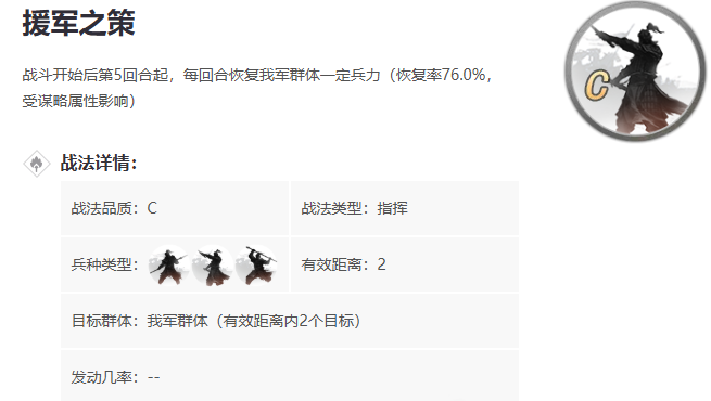 援军秘策是一种B级指挥型战法,主要通过拆解特定武将获得。该战法的核心效果是从战斗第五回合开始,每回合稳定恢复我军群体兵力,恢复率受谋略属性影响,满级可达103%。作为重振旗鼓的低配版,它在游戏中期过渡阶段具有重要战略价值,尤其适合蜀步队、菜刀队等偏肉型阵容使用。