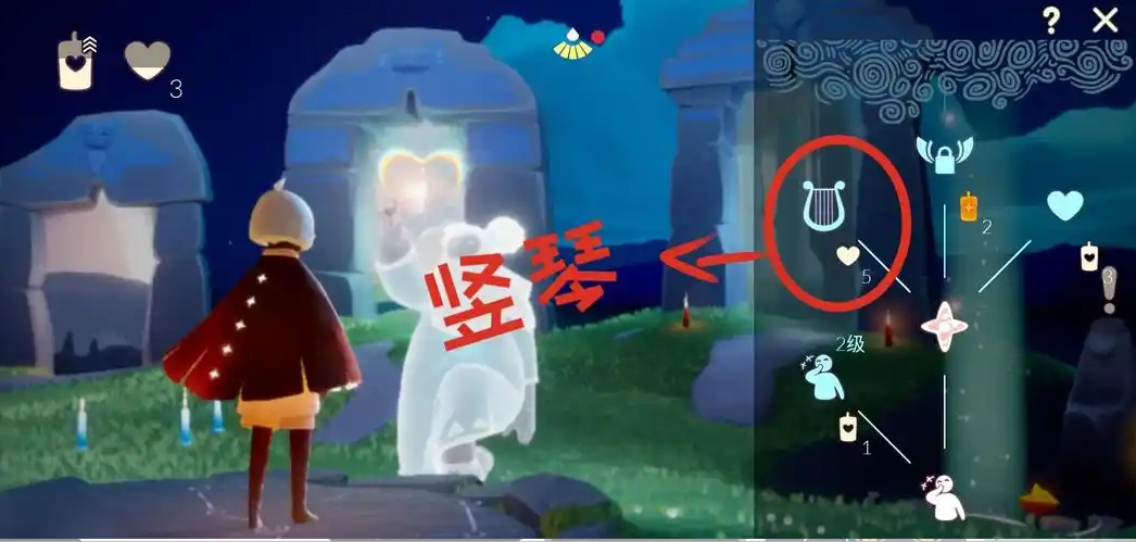 竖琴先祖位于云野地图的三塔图山洞里,进入云野后往右飞就能发现这个隐藏位置。找到偷笑先祖后,需要完成他的回忆任务,解锁动作后才能兑换竖琴。兑换需要消耗5个爱心,爱心可以通过和好友互赠蜡烛或直接用3根蜡烛兑换1个爱心的方式获得。记得提前准备好足够的蜡烛,避免跑图时资源不足。
