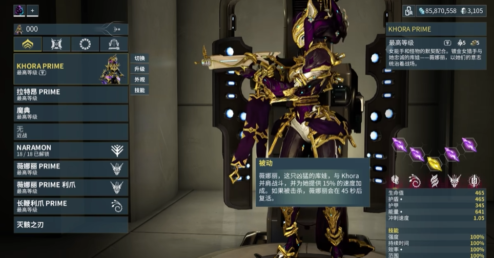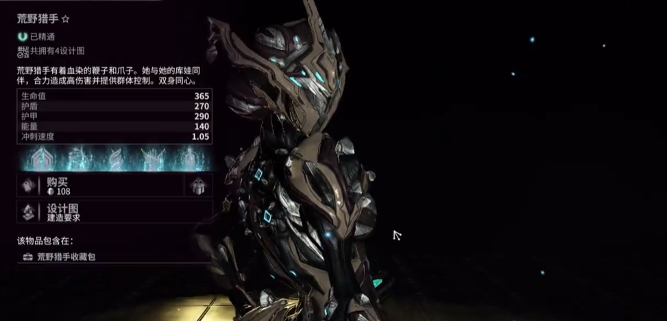 该战甲的战斗定位偏向范围控制与高爆发输出。1技能血爪鞭袭受近战连击倍率加成,配合集团MOD可显著提升伤害;2技能活钢陷阱提供群体禁锢效果,适合应对密集敌人;3技能可操控战甲自带的狯犽伙伴维纳利,切换不同战斗姿态辅助作战。被动技能提供移速加成,强化机动性。