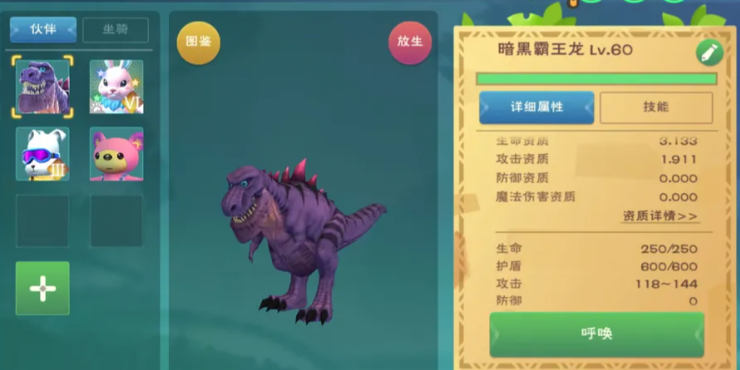 宠物分为攻击宠、肉盾宠和辅助宠三大类型,每种类型都有各自的优势。毒液龙作为攻击宠中的佼佼者,虽然攻击资质不算最高,但它是唯一能远程攻击的战宠,毒液技能可叠加5层伤害,而且升级经验需求低,55级等级上限让它成为性价比极高的选择。黑暗霸王龙则是攻击力天花板,满资质2.0的攻击初始值配合100%触发的流血技能,后期攻击力能达到玩家三倍但抓捕难度和培养成本都相当高。
