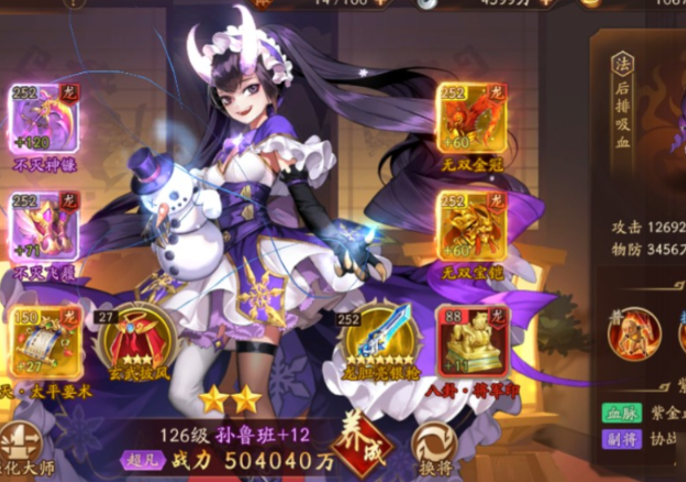 当前版本中诸葛果、孙鲁班、曹节和吕绮玲这四位武将表现尤为突出,她们不仅是核心主将,还能搭配不同副将形成强力组合。诸葛果的输出和治疗能力非常优秀,还能减少敌方怒气;孙鲁班擅长锁血和反伤,配合吸血效果能在残局翻盘;曹节则是爆发型选手,控制与破甲效果让敌人头疼;吕绮玲的攻防增益和护盾为团队提供了坚实保障。这些紫金将的基础属性本身就比其他武将高,后期重点培养她们能让战力大幅提升。