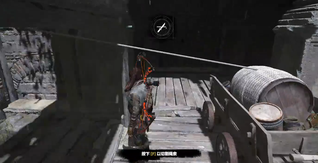 当配重锤落到地面后,立刻用绳索箭将它和推车连接起来。这一步需要手速快一点,否则配重锤会回升。成功后,推车会被固定住,而另一侧的吊篮平台则会升起来。这时候别愣着,赶紧跑到升起的平台附近,借助它跳到对面墙上的攀爬点。如果动作慢了,平台可能会回落,那就得重新操作一遍。
