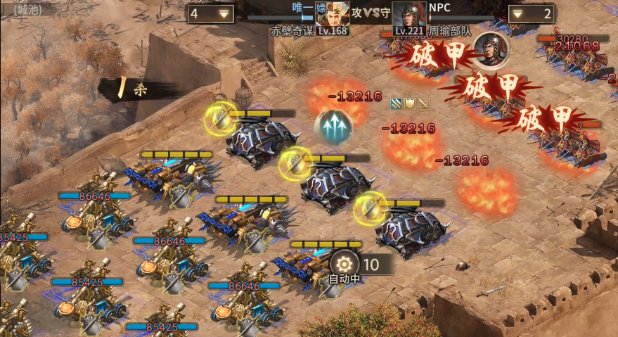 221级周瑜副本其实比220级简单不少,NPC的攻防血量都下调了,而且战车护盾特效的火烧不会破甲。不过非觉醒武将的战法会被NPC抵挡,所以咱们尽量派觉醒武将上场。推荐阵容是觉醒夏侯渊或甄姬打头阵,黄月英带孙权副将中间输出,周泰收尾,甘宁备用。如果黄月英发挥好,可能三个武将就能搞定,最多四个武将足够。