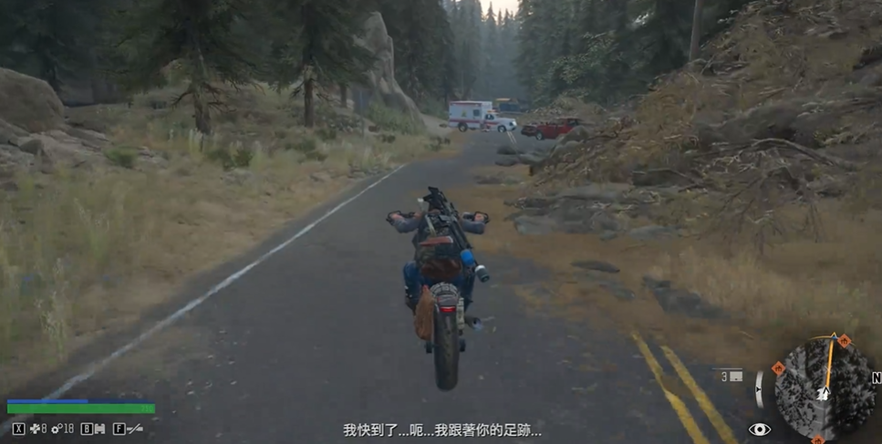 玩家需要骑车沿着公路寻找酒鬼。路上会散落更多酒瓶,跟随这些线索最终会在公路上遇到醉醺醺的酒鬼。酒鬼情绪低落,甚至试图走进暴走潮中,玩家需要通过对话劝说他返回营地。成功说服酒鬼后,需要骑车载着他突破暴走潮的追击,这段骑行需要注意避开障碍物和敌人,确保酒鬼安全抵达营地。