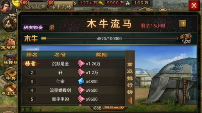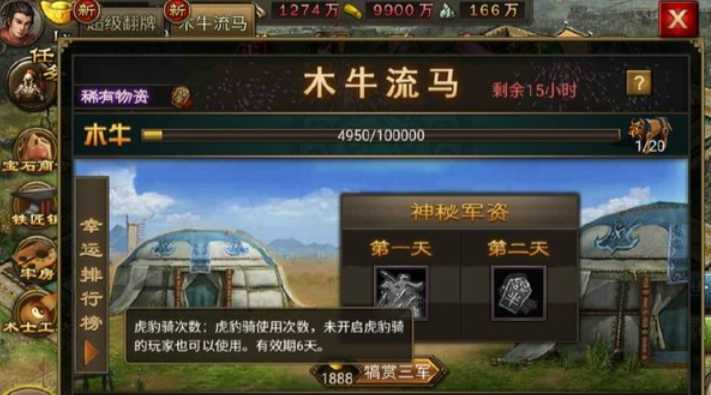 拿到木牛流马这种稀有物资,咱们得先了解它是干啥用的。这玩意儿在游戏里可是个宝贝,能帮咱们提升战力,还能在军团调动和资源配送时派上大用场。它的特效也挺特别,不过具体效果得看你怎么用。一般来说,木牛流马属于限时活动奖励,所以得抓住机会参与特定活动才能拿到手。