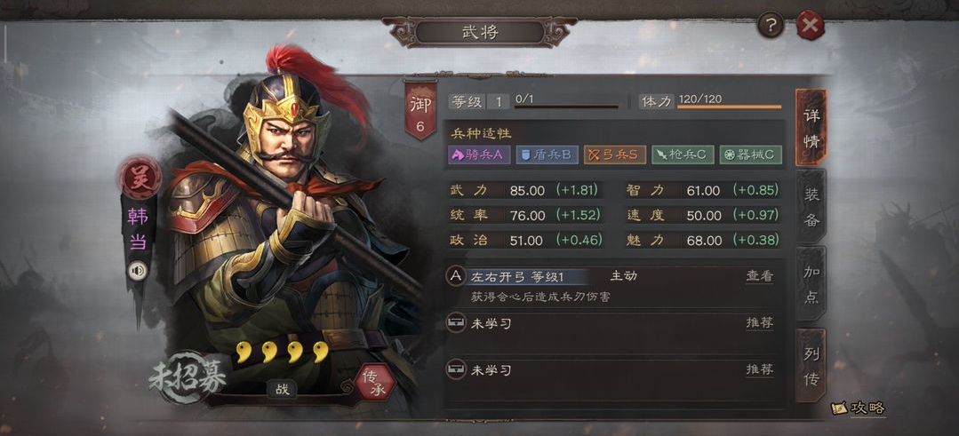 孟获属性与兵种优势突出,统率成长优秀,承伤能力处在上游水平,武力属及格线以上,走肉盾输出路线完全够用,统御7点适配多数阵容编排,骑兵与盾兵双S适性让他既能组象兵骑队,也能搭藤甲盾体系,枪兵A适性可作为补位选择,泛用性在群雄武将中处于中上区间。实战中站位靠前承担普攻伤害,配合自带战法的群体伤害频率,能快速压低敌方整体血线,搭配抵御类战法可有效规避震慑负面,延长持续作战时间,在缺少核心橙将的账号中,可稳定承担主力输出位,降低阵容成型成本。