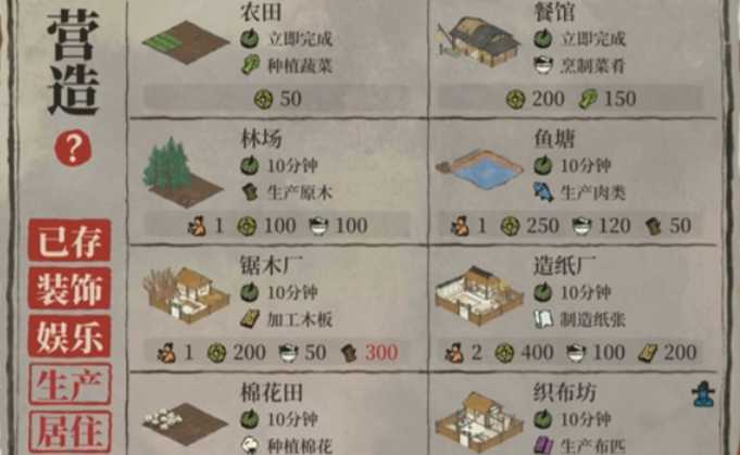 江南百景图中,民宅、生产建筑、商业建筑、行政功能性建筑、娱乐建筑、仓库及部分特殊建筑均需要道路连接,装饰类、景观类建筑则无需道路。
