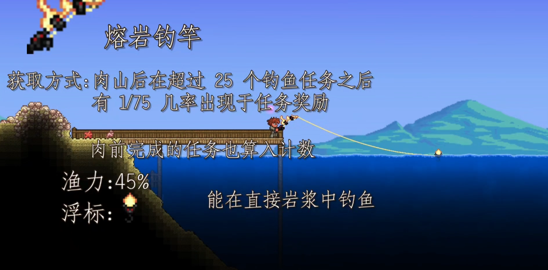 热线鱼竿(也称为熔岩钓钩)是一种特殊钓竿,允许你在熔岩中钓鱼,获取独特的鱼类和资源。它的获取方式比较特别,需要通过完成渔夫的任务来概率获得。渔夫通常会在海边生成,看起来像一个小男孩。找到他后,确保给他安排一个合适的房间让他入住。房间需要有光源、桌椅和墙壁,否则他不会留下来。一旦渔夫入住,每天都可以找他接取钓鱼任务,任务要求你在特定地点钓上指定的鱼。