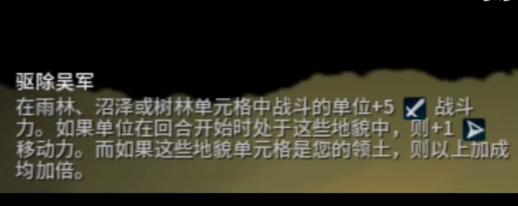 赵夫人的核心能力是驱除吴军,这个能力让咱们的单位在雨林、树林或沼泽地块作战时获得战斗力加成。如果这些地块属于咱们的领土,加成还会翻倍。单位在这些地块开始时还能获得移动力加成。这种设计让越南文明在特定地形中拥有极强的防守和机动性,非常适合喜欢利用地形优势的玩家。