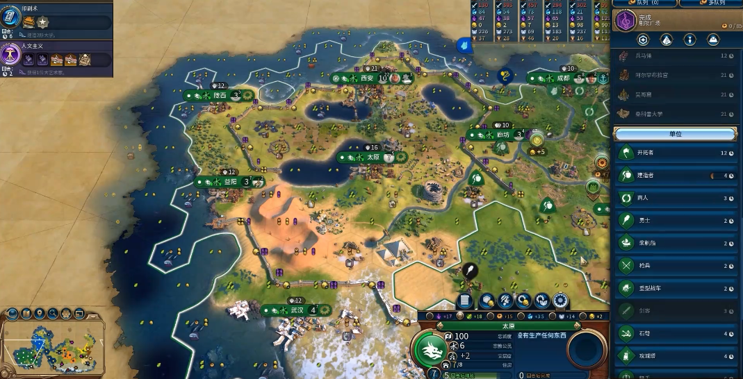 征服路线的科技优先选择畜牧业、弓箭和骑马,这些是解锁早期主力兵种的关键。市政树需快速解锁技艺政策卡以加速建造者生产,同时通过寡头政治政体提升近战单位战斗力。资源管理上需确保战略资源储备,尤其是马匹和铁矿石的稳定供应,这是维持军队规模的基础条件。城市布局应采取三角辐射模式,分城间距控制在6-8格,既能避免文化边界重叠又能最大化领土收益。